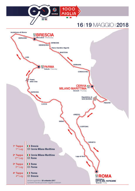 440 cars will start the race at Brescia at 2.30 pm and will make the turning point in Rome and return to Brescia on Saturday 19 May with stages in Cervia-Milano Marittima, Rome and Parma.